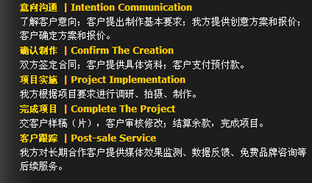 保證力——作業(yè)流程   我們一直相信,只有科學(xué)、規(guī)范的作業(yè)流程作為運作保障,優(yōu)秀的創(chuàng)意才能得以完美的實施。在經(jīng)典影視,我們一直秉承——策略精準(zhǔn) . 創(chuàng)意新銳 . 執(zhí)行出色。